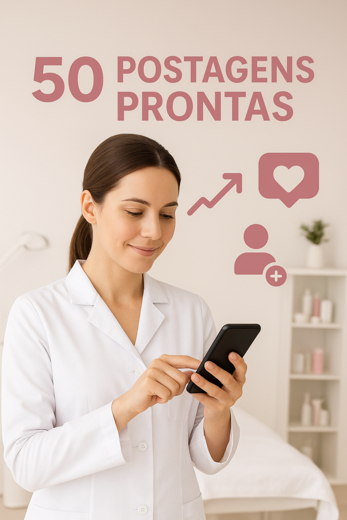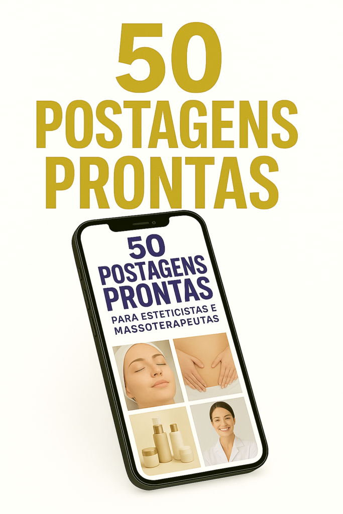 50 postagens prontas para usar, criadas por uma esteticista com mais de 25 anos de experiência e por sua equipe de estrategistas em marketing para estética e massoterapia!!!
